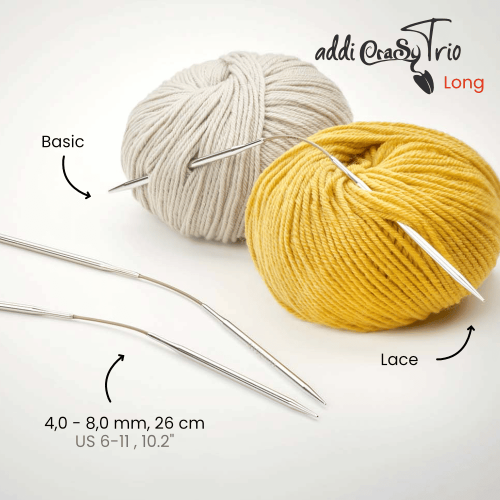 Addi Crasy Trio Long är ett set med tre flexibla strumpstickor som gör det enkelt att sticka små omkretsar, som strumpor, ärmar och muddar. Varje sticka har två längre spetsar och en flexibel kabel i mitten, vilket ger en smidig och bekväm stickning. Du arbetar med två stickor medan den tredje håller maskorna vilande, vilket minskar antalet stickor jämfört med traditionella metoder. Det finns flera klipp på YouTube. Tillverkad i Tyskland.